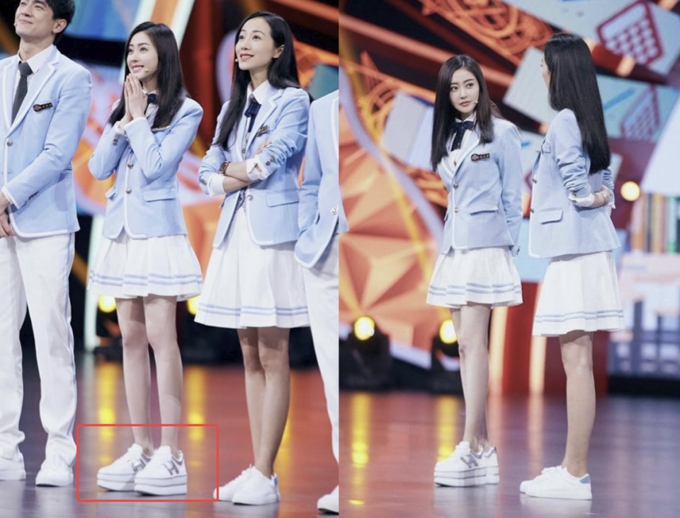 张天爱穿着看起来起码8cm的厚底松糕鞋,还没有170cm穿着平底鞋的韩雪高。